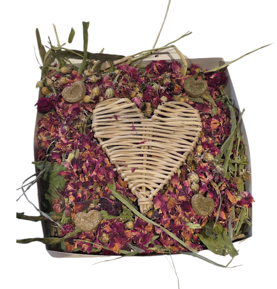 Get ready for a hop-tastic treat with our Love at First Nibble forage box! Packed with scrumptious Timothy hay, Plantain leaves, dandelion leaves and strawberry leaves sprinkled with love (and rose petals), it's a buffet fit for bunny royalty. Toss in some fruity hearts and watch your furry friend’s heart leap with joy! Perfect for making any bunny go weak in the knees! 🐰❤️